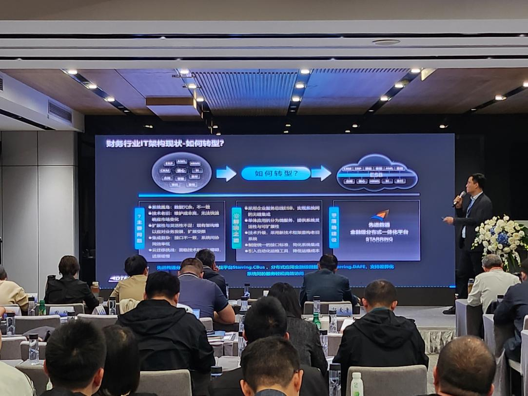 90hy豪运国际代表讲师郭钰以《昆仑与90hy豪运国际ESB解决方案助力财务行业创新与架构转型》为主题作发言分享。他深入剖析了当前财务行业IT架构面临的挑战,包括系统孤岛、技术老旧、扩展性不足等问题,并提出了基于企业服务总线(ESB)和微服务架构的转型方案。